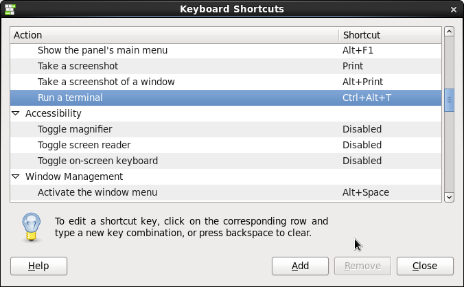 ۲.از زیر مجموعه Desktop گزینه ای به نام Run a Terminal وجود دارد. که مقدار آن disabled است. روی مقدار disbaled کلیک می کنیم. کلید ترکیبی که می خواهیم از این پس با فشردن آنها ترمینال باز شود را می فشاریم. به طور مثال ctrl+alt+T .